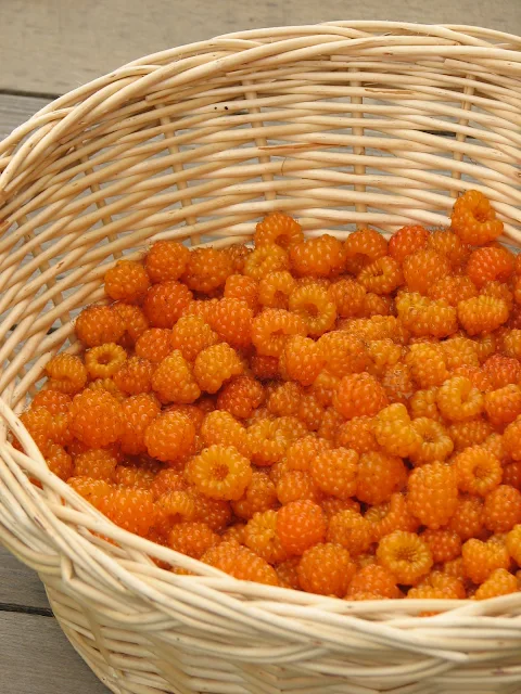 I took Cyan and Logan on a walk this morning with my picking baskets and we picked a bunch! We found, to our dismay, that they also have little thorns, but it just reinforced the fact that they were in this family and this type of berry. They have a sweet tart flavor, very similar to a Salmonberry, but a bit sweeter. Like a VERY light flavored blackberry. They will make something yummy for dessert tonight.