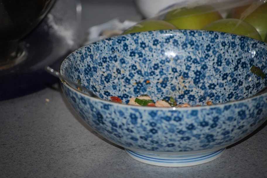Esp the little flower one... so I bought a coordinating serving bowl (above) in a pattern like that. Here it is with fresh local basil and tomatoes with fresh mozzerella. I couldn't wait to use it... I rinsed it and filled it within 15 minutes of getting home. :)