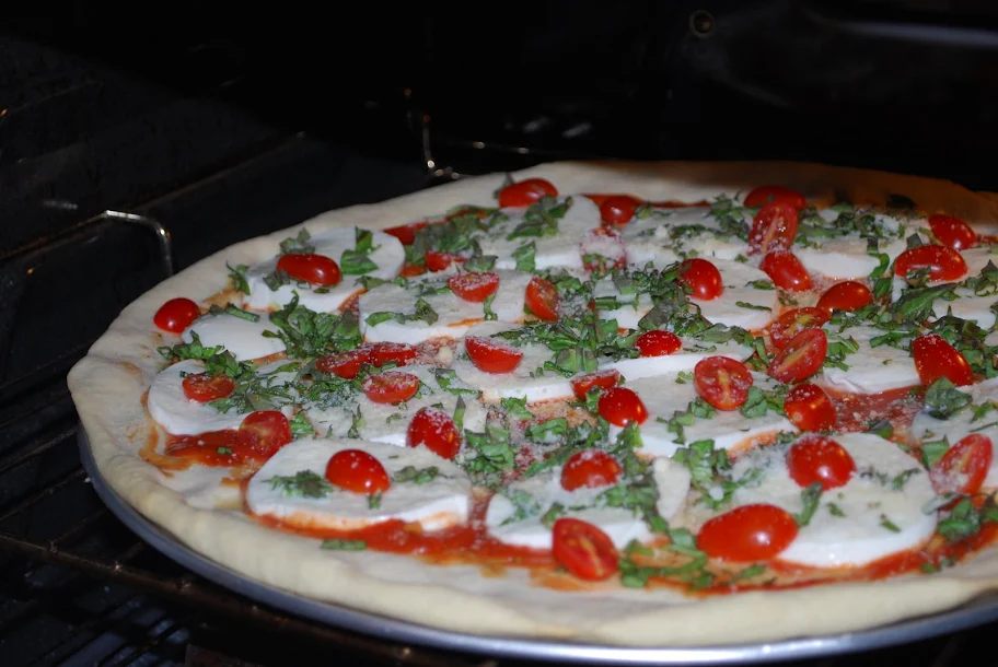 Basil, fresh motzerella, and cherry tomatoes for tonight... and oh so good! Next time I will make a Italian Herb crust to go with it.